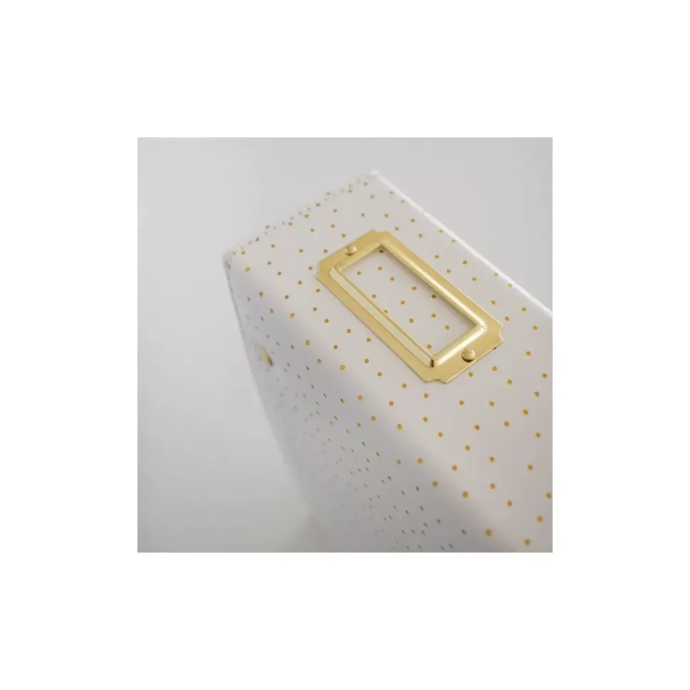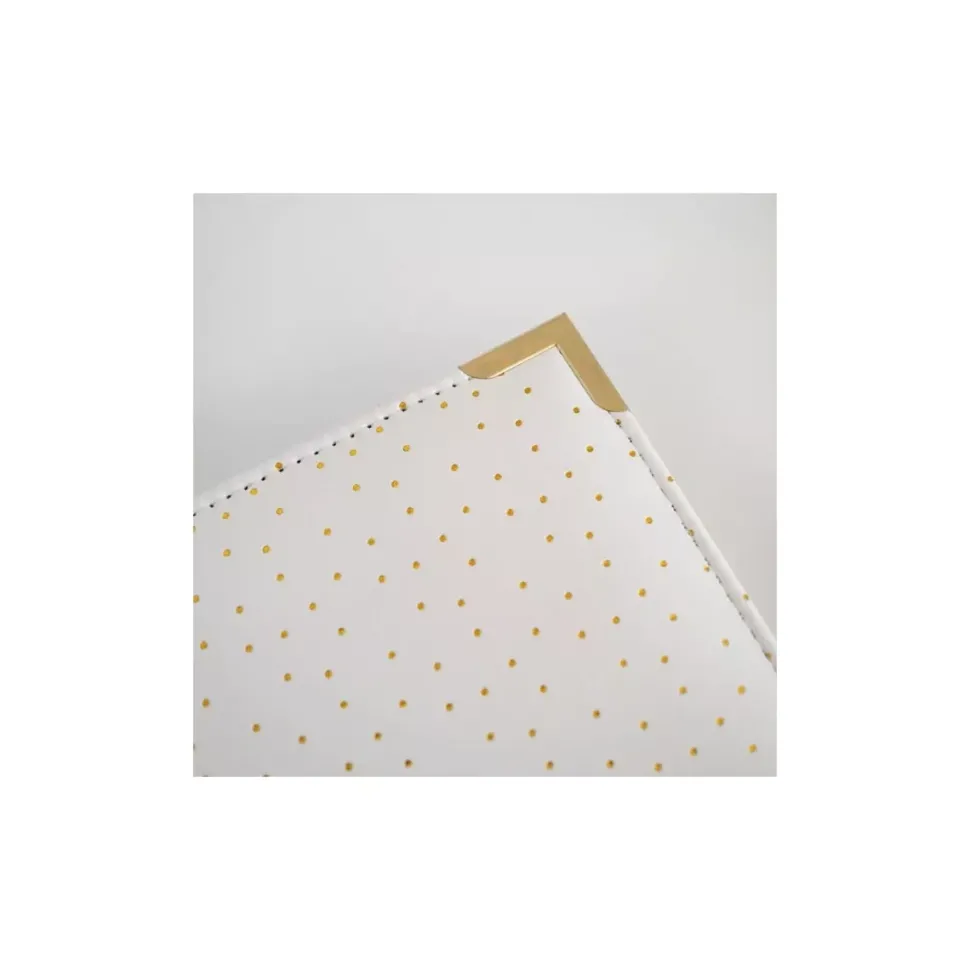 - Tiene un estampado de pequeños puntitos en foil dorado sobre un fondo blanco.