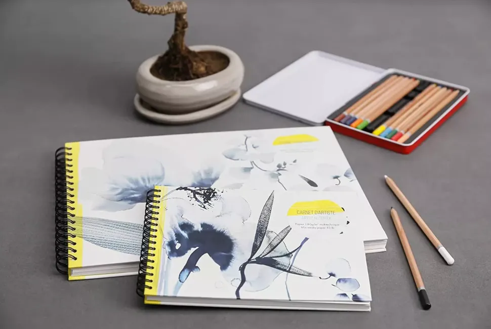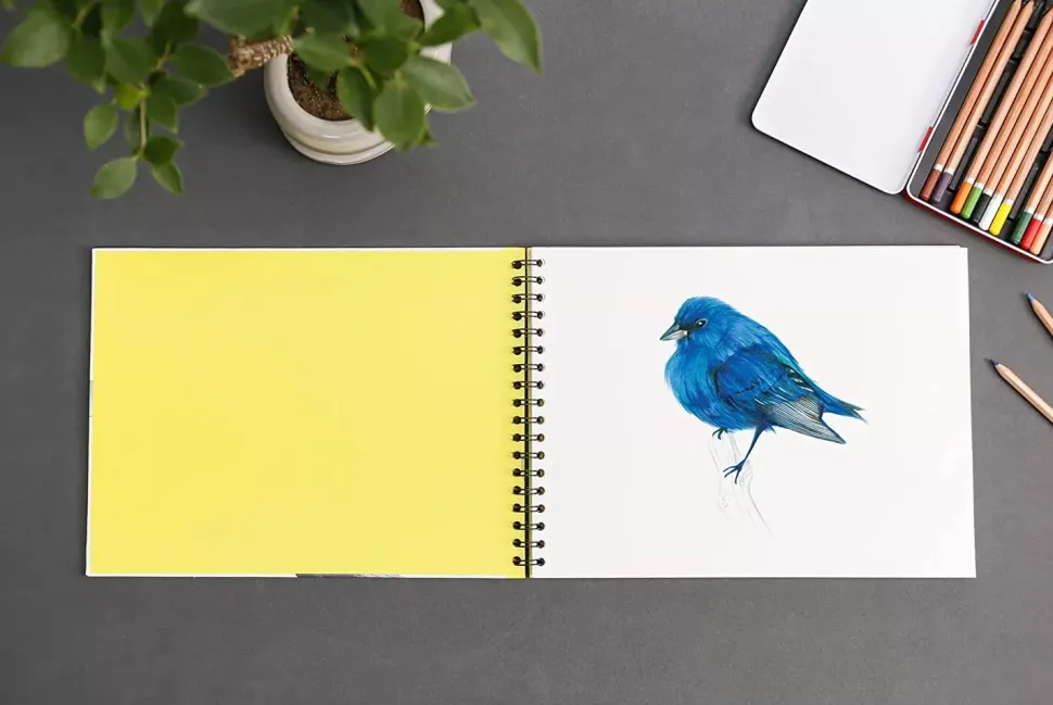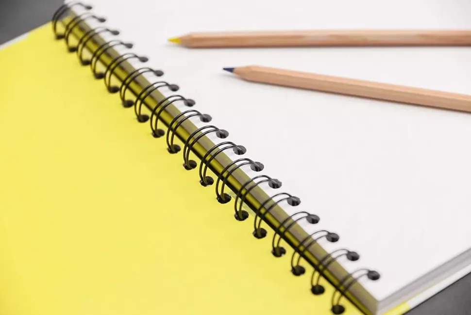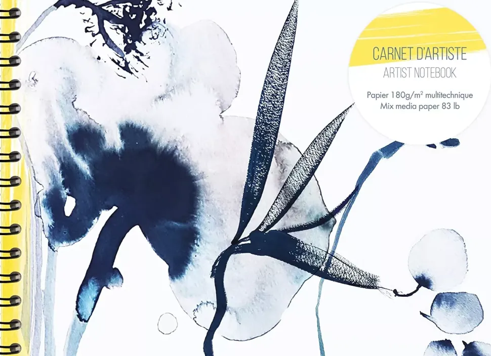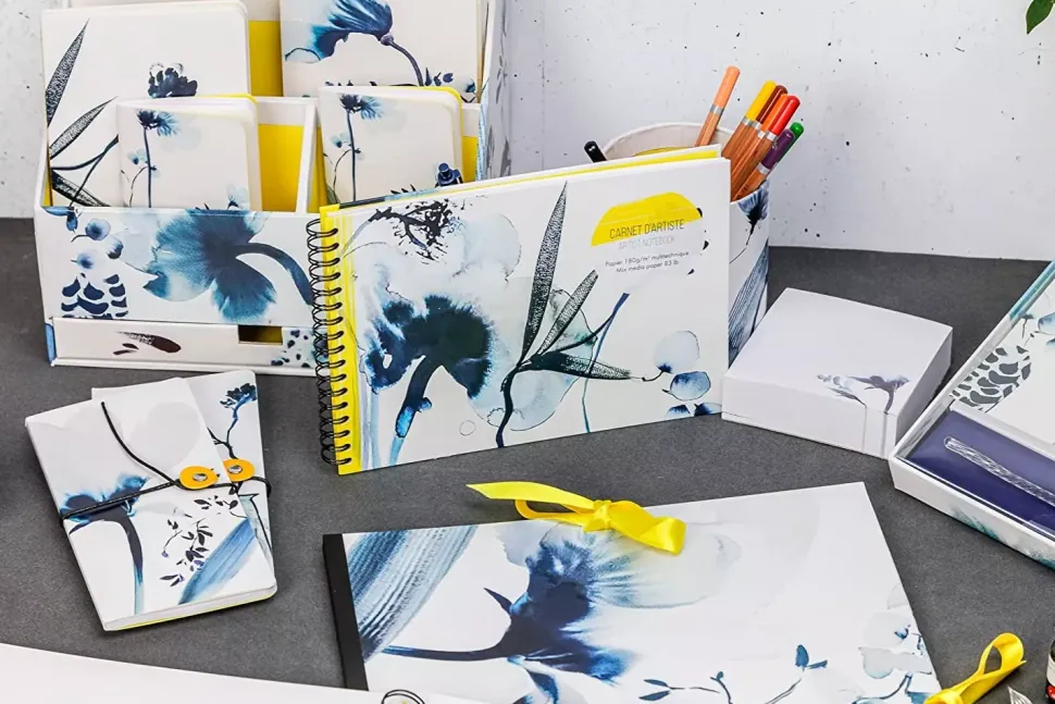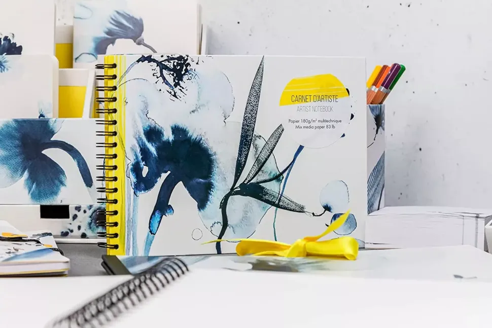 - Cubierta rígida en color blanco con borde amarillo y dibujo de unas flores en color azul.