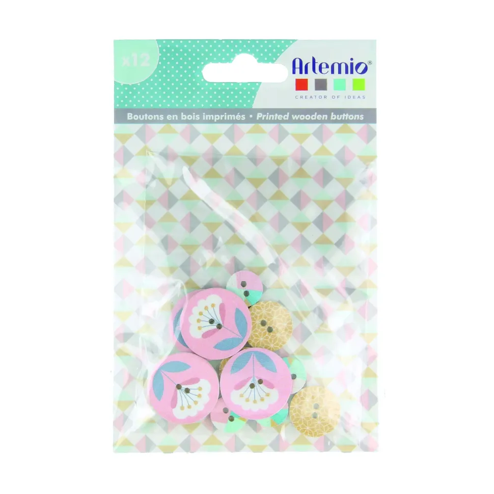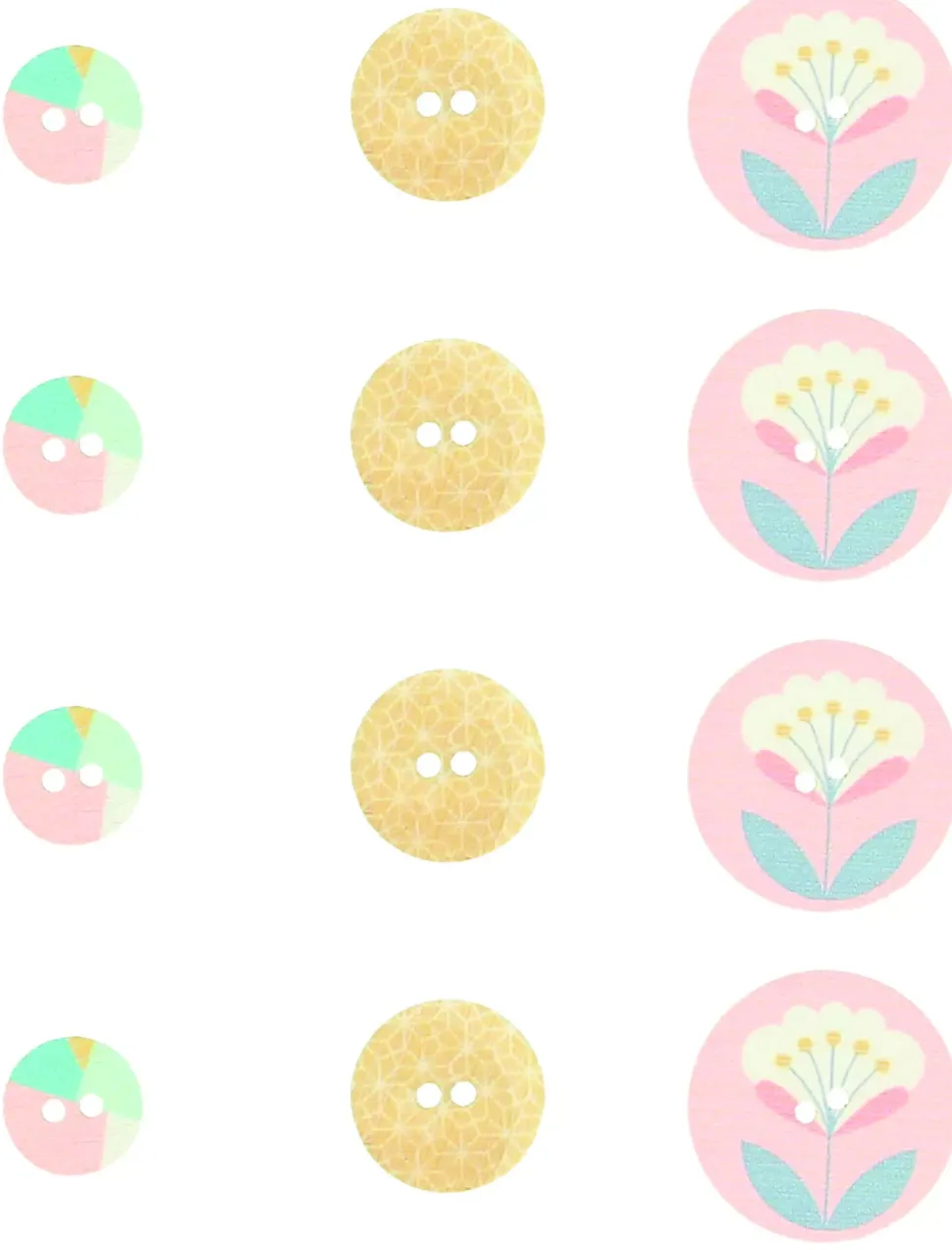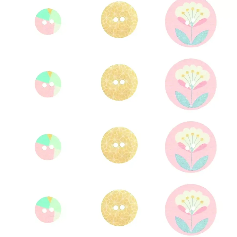 - Incluye 12 botones de colores pastel y estampado geométrico y con flores.