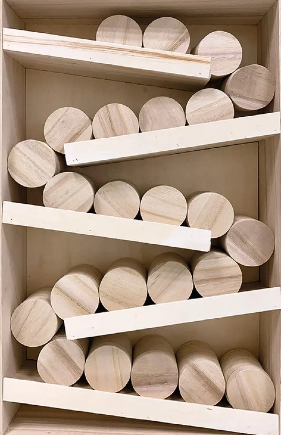 - Incluye 24 cajones circulares que pueden rodar por el recorrido de la caja de madera.