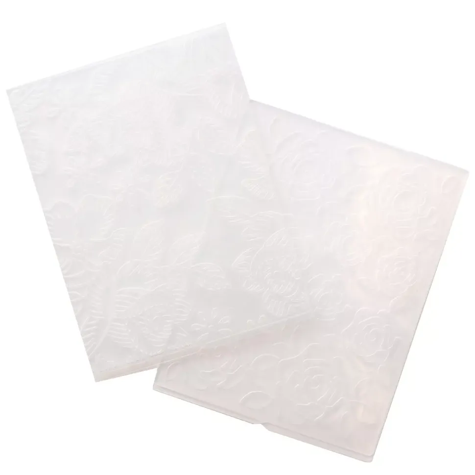 - Contiene 2 carpetas para realizar dos preciosos embossing con un patrón de rosas con hojas y un segundo con motivos vegetales de hojas.