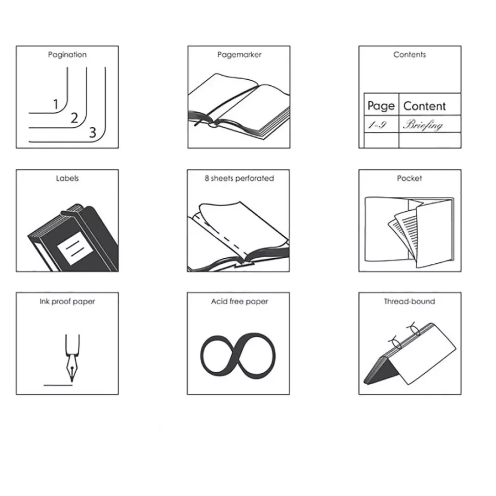 - Se caracterizan por su goma elástica para cerrar, un bolsillo trasero y un marcapáginas. Además tiene sus 121 páginas numeradas y una tabla al inicio para hacer tu propio índice.