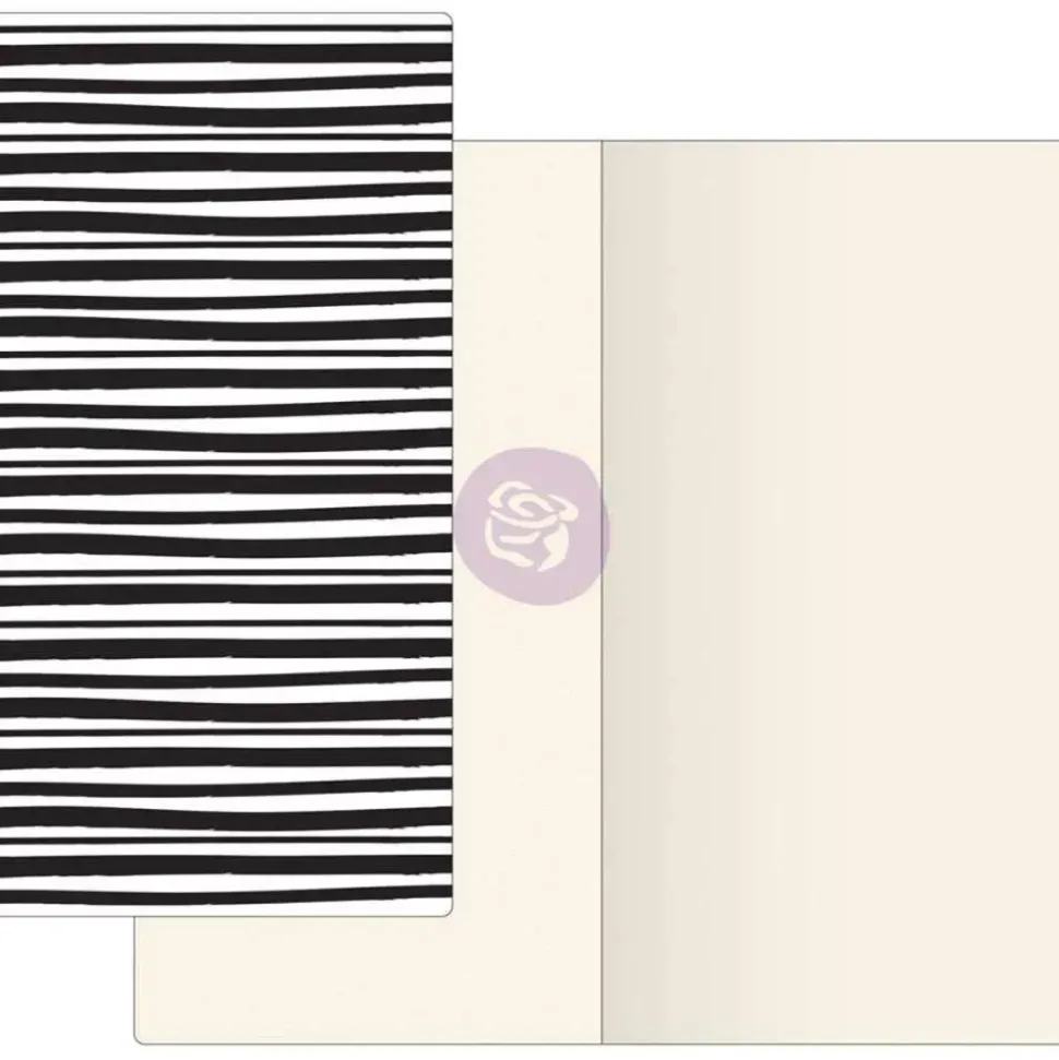 Este cuaderno es especial al contener 32 hojas de color marfil. La portada tiene rayas horizontales irregulares blancas y negras.