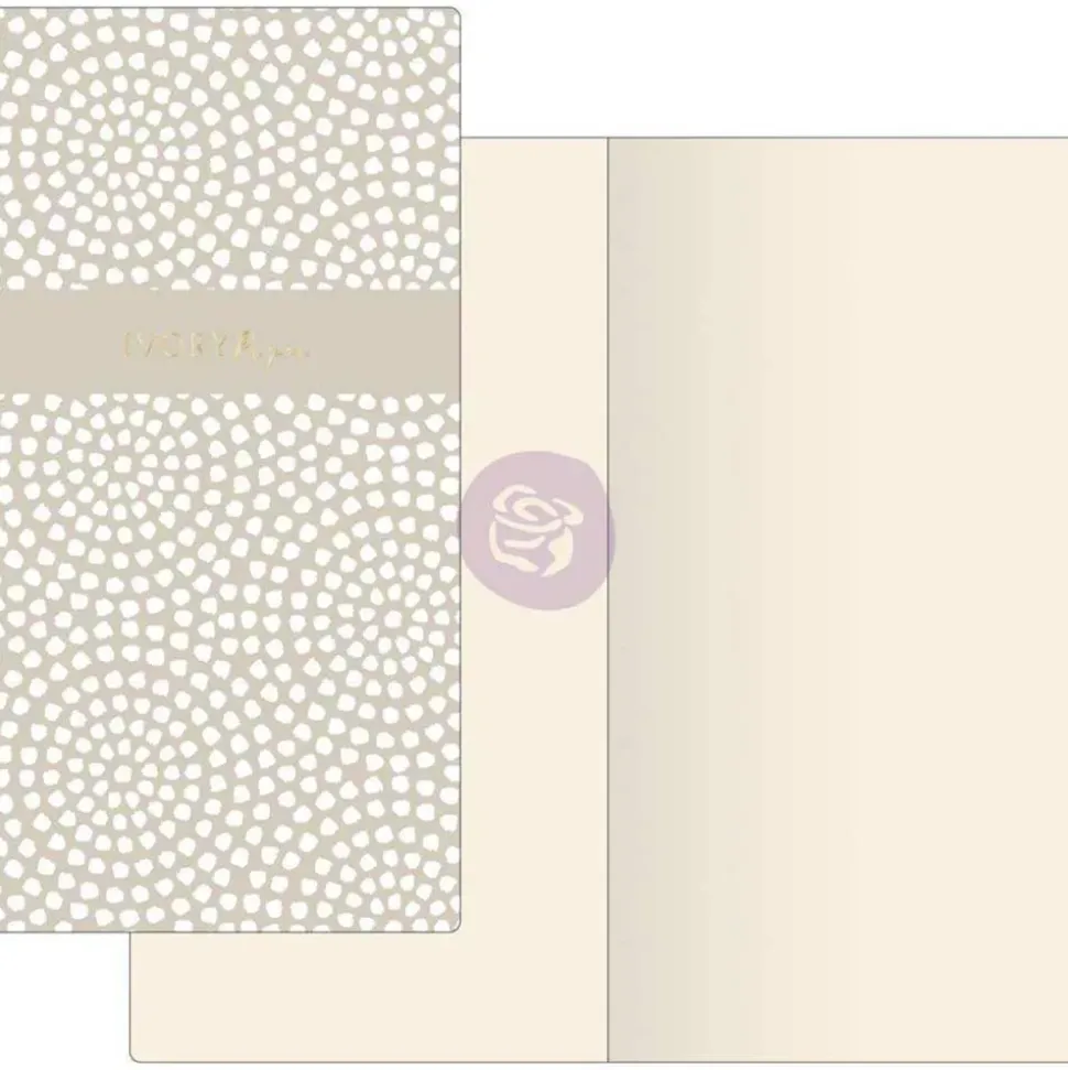 Este cuaderno es especial al contener 32 hojas de color marfil. La portada tiene diseños de manchas blancas en forma de círculos sobre fondo crema y un título en dorado con el texto Ivory paper.