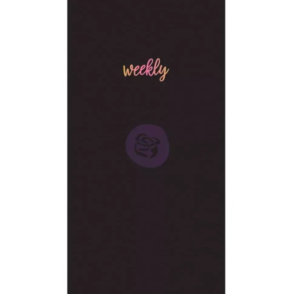 Este cuaderno es especial al contener 32 hojas de color blanco. La portada es negra y tiene impreso el texto weekly en foil holográfico.