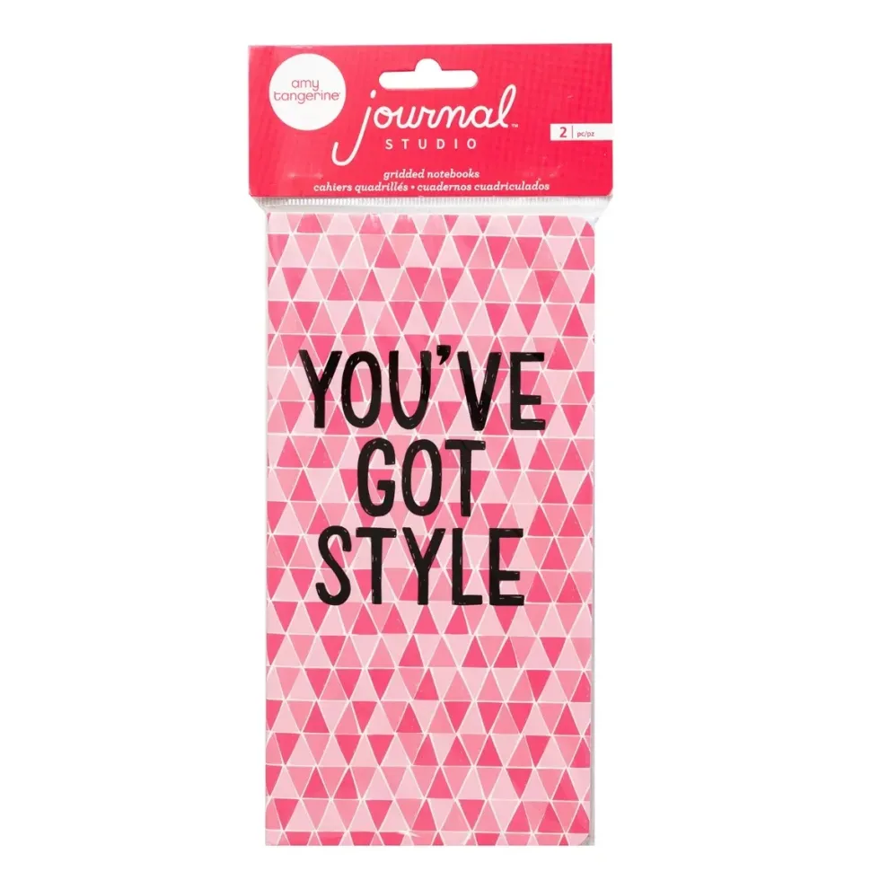 - Un cuaderno posee portadas de triangulos en tonos rosas con la frase you’ve got style. El segundo incluye flores de colores con el lomo holográfico.