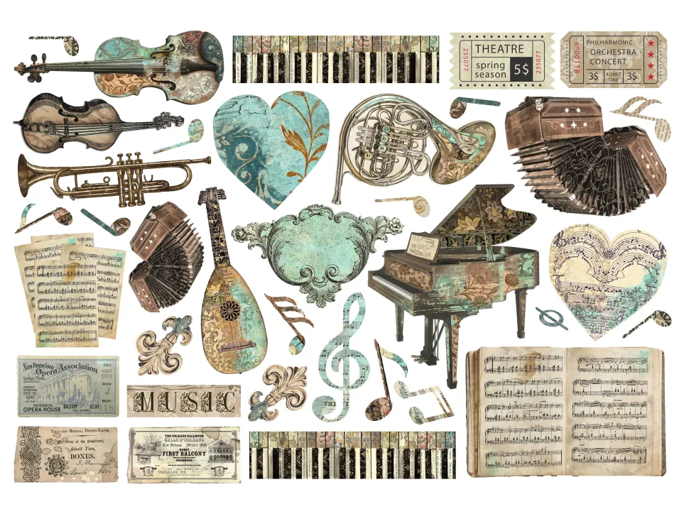 Music es la nueva colección de Stamperia. En ella los protagonistas son los instrumentos y las partituras, con ilustraciones de estilo vintage que combinan turquesas y marrones. La armonía de la colección inspira a la creatividad con intrincados detalles y hermosos complementos, para crear proyectos únicos y atemporales. Descubre sus papeles y disfruta con todos sus complementos, como die-cuts, stencils, sellos y mucho más. ¡Descubre ya Music!