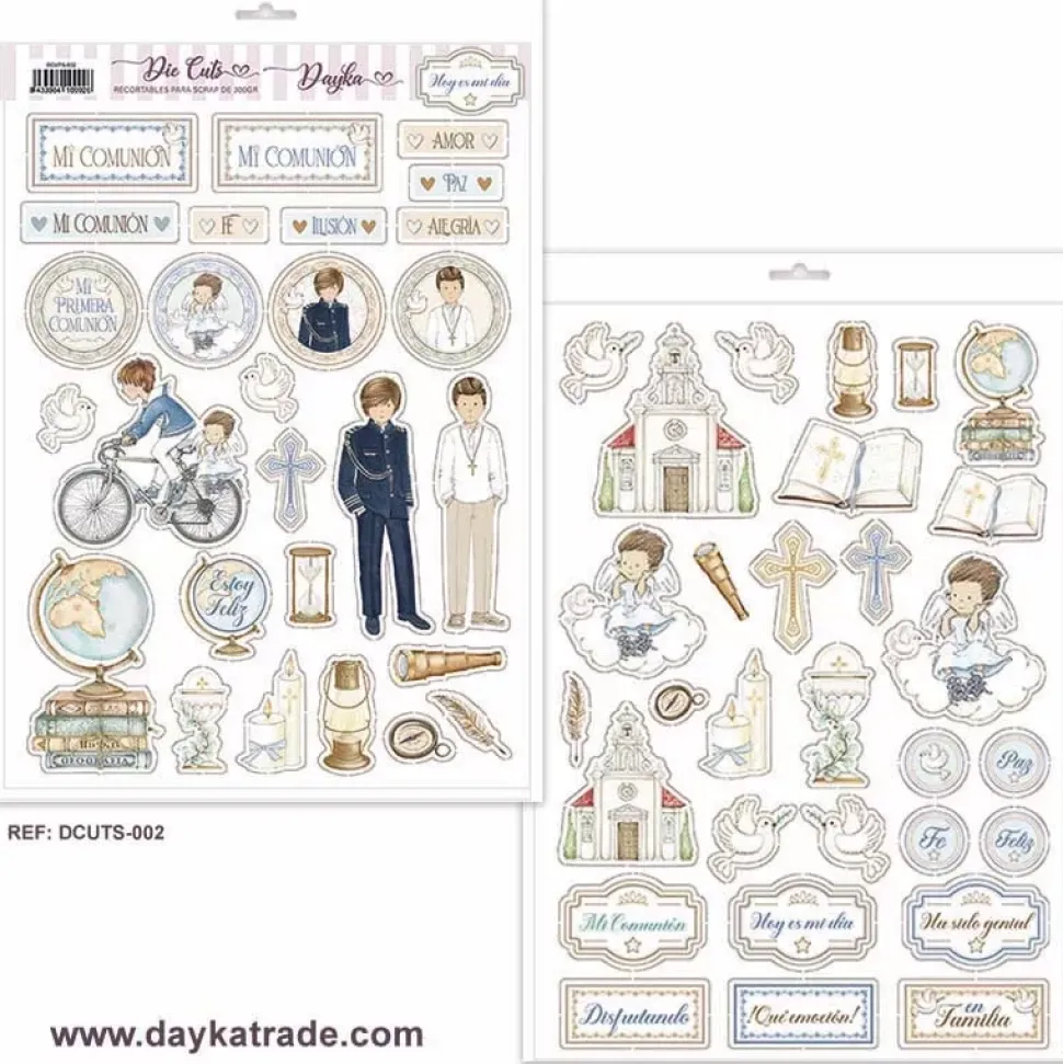 - Dos papeles con elementos para recortar de la colección de comunión Hoy es mi Día de Dayka.