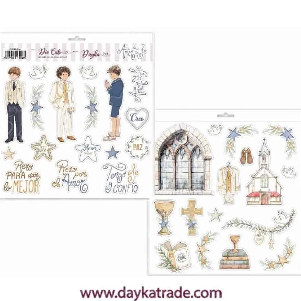 - Incluye 32 die cuts con ilustraciones de niños vestidos de comunión, palomas, libros, iglesias, flores y más.