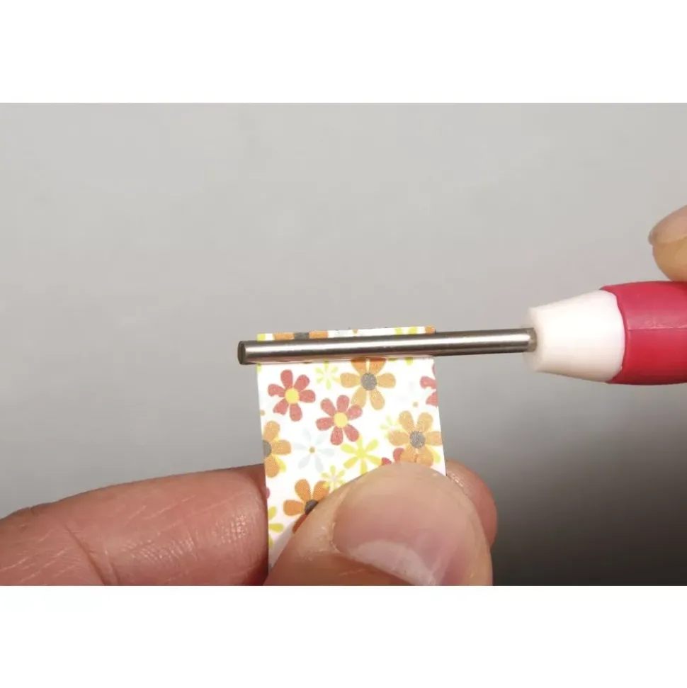 - Desliza la tira de papel en la ranura de la herramienta y enrolla el papel girándola.