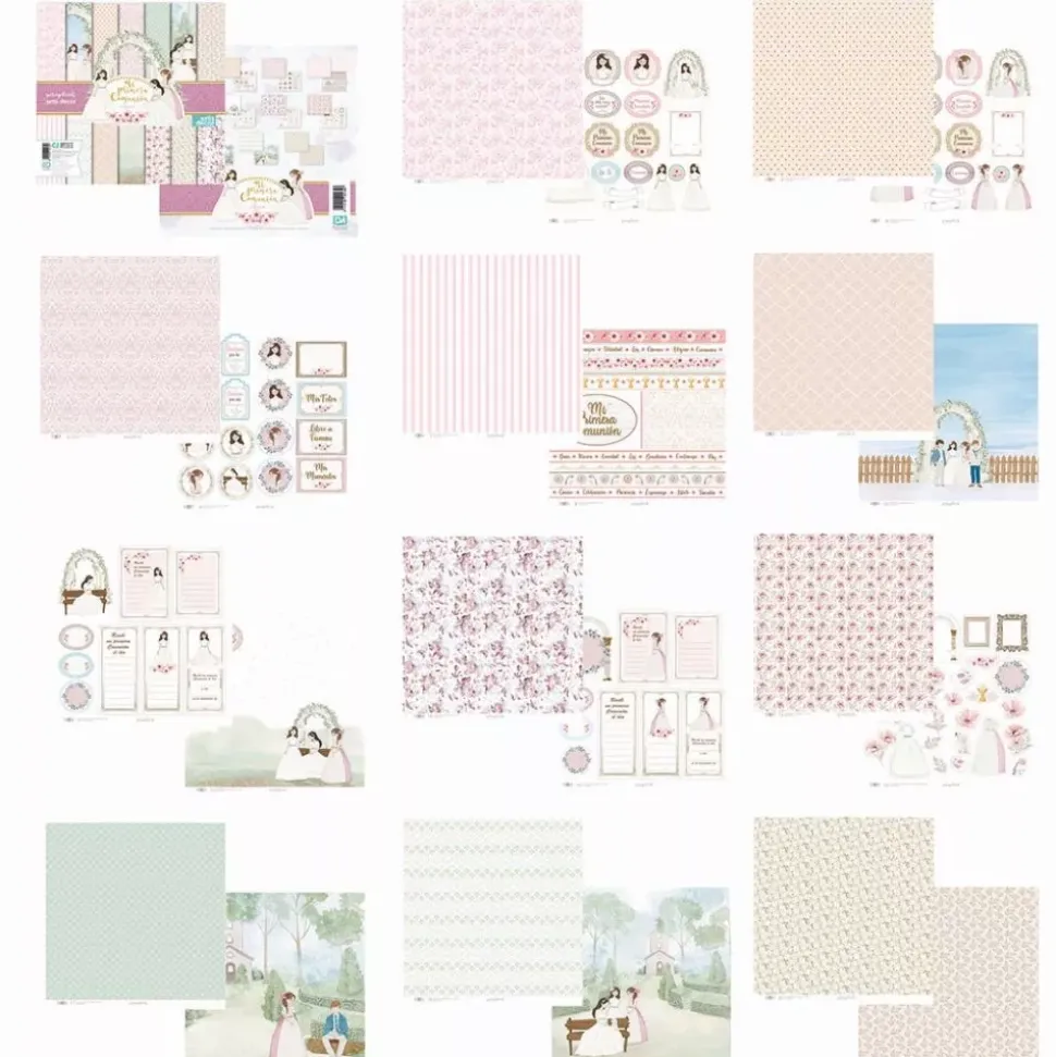 - Los papeles están decorados con motivos florales, etiquetas e ilustraciones de niñas vestidas de comunión.