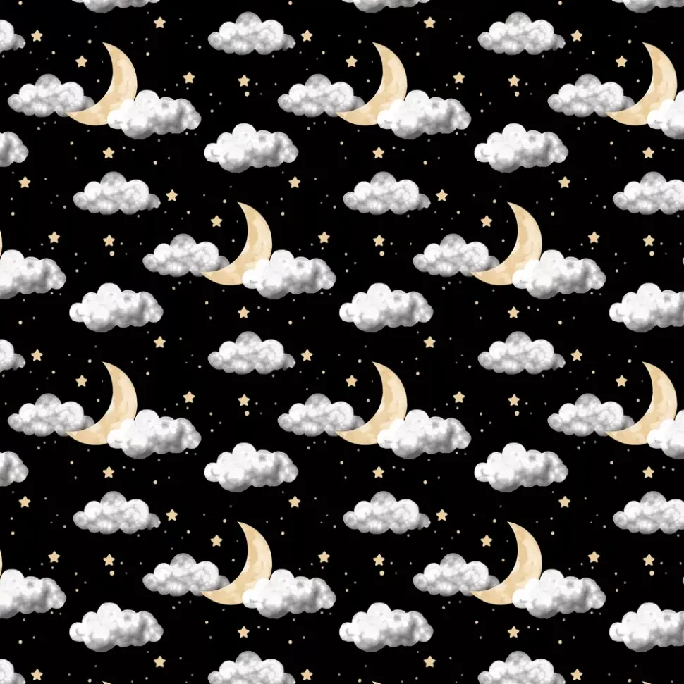 - Papel estampado con tarjetas de 3″x4″ con motivos de la colección. La parte posterior del papel cuenta con un patrón de nubes, lunas y estrellas sobre un fondo negro.