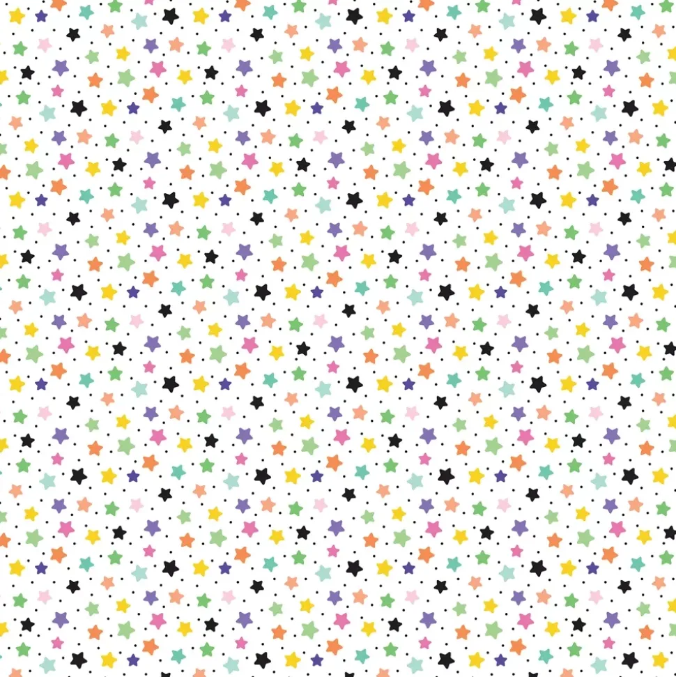 - Papel estampado con tarjetas de 3″x4″ con motivos de la colección. La parte posterior del papel cuenta un patrón de estrellitas en los colores de la colección sobre un fondo blanco.