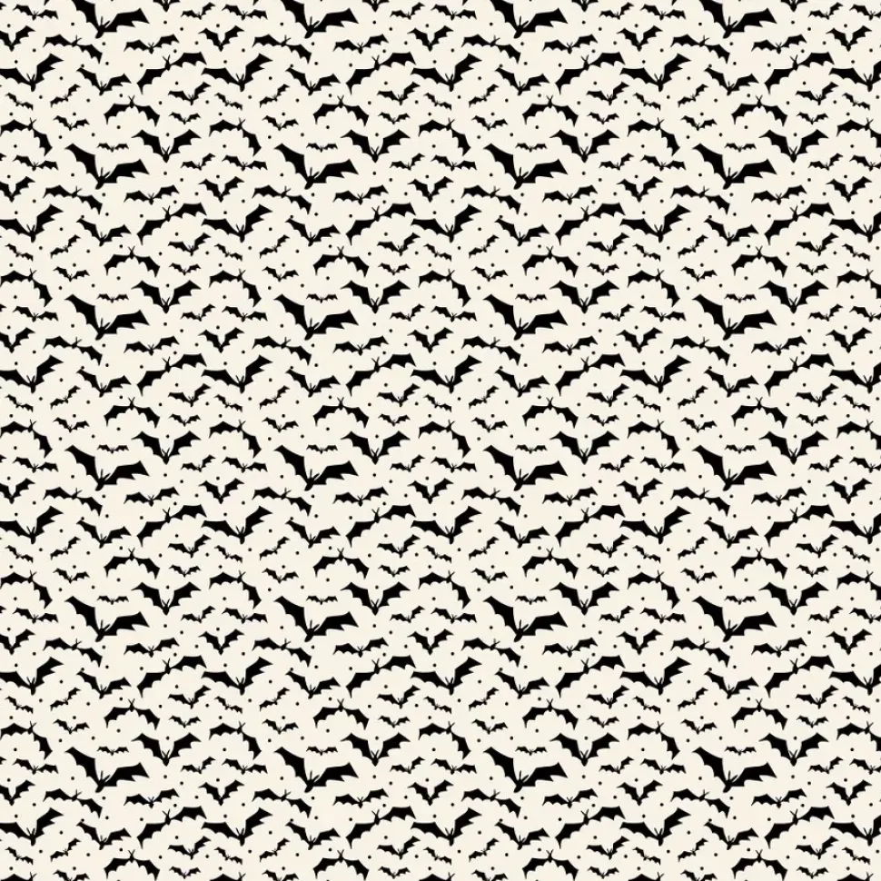 - Papel estampado con tarjetas de 4″x4″ con motivos de la colección. El reverso del papel cuenta con un estampado de murciélagos negros sobre un fondo blanco.