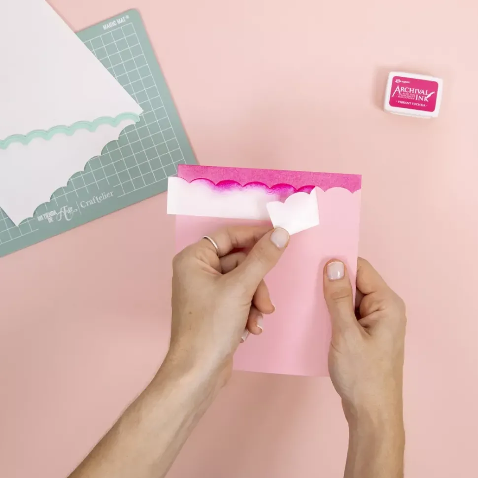 - Láminas de papel adhesivo ideales para crear máscaras con nuestros troqueles y sellos.