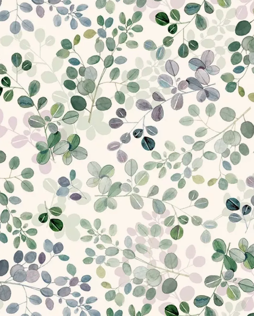 - Diseño de hojas de eucalipto en tonos verdes y morados.