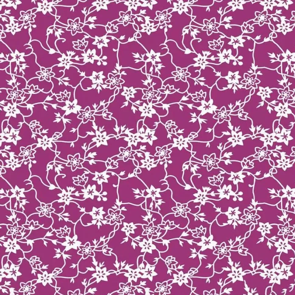Papel con decoración de florecitas blancas en forma de enredadera sobre fondo morado.