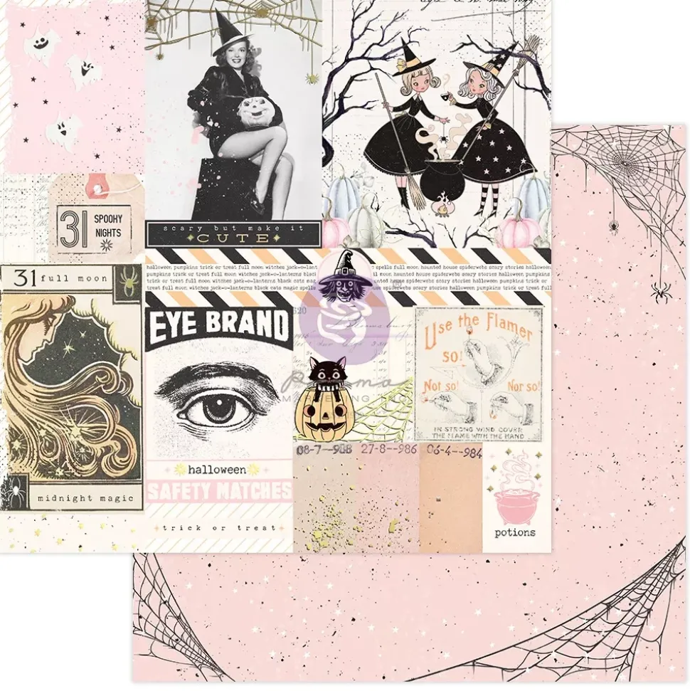 - Papel estampado con tarjetas con estampados de la colección. Por la cara posterior, presenta un diseño en tonos rosas con telas de araña.