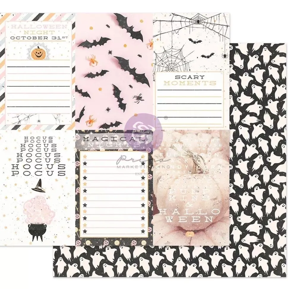 - Papel estampado formado por diferentes tags con motivos de la colección y espacio para que podamos escribir en ellas. La parte posterior del papel cuenta con un patrón de fantasmas sobre un fondo negro.