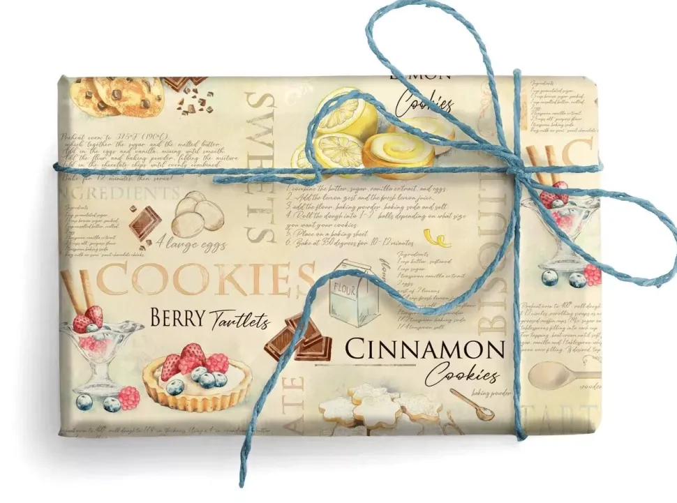 - Papel de alta gama impreso con un estampado de recetas de cocina e ilustaciones de comida.