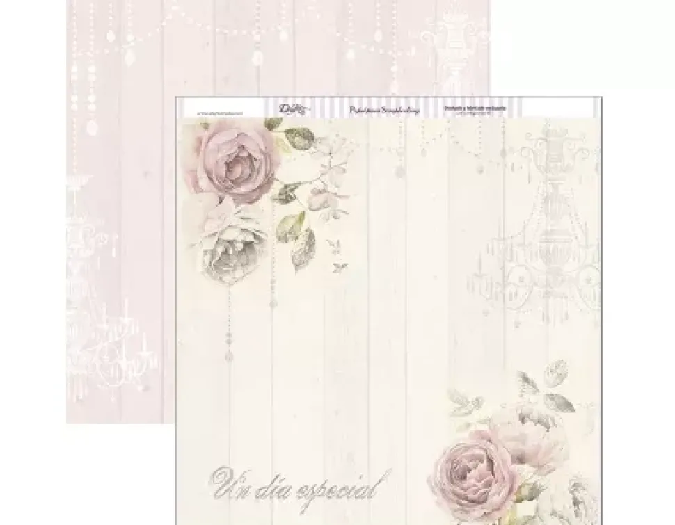 - – Papel estampado con textura de madera con ornamentación de rosas y la frase en castellano «un día especial» Por la cara posterior encontramos una preciosa textura de listones de madera.