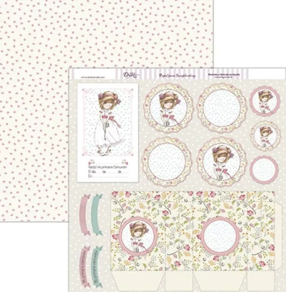 - – Papel estampado con galletas y etiqueta de niña de comunión y un recortable para hacer una bolsa. Por la cara posterior, corazones rosas sobre fondo blanco roto.