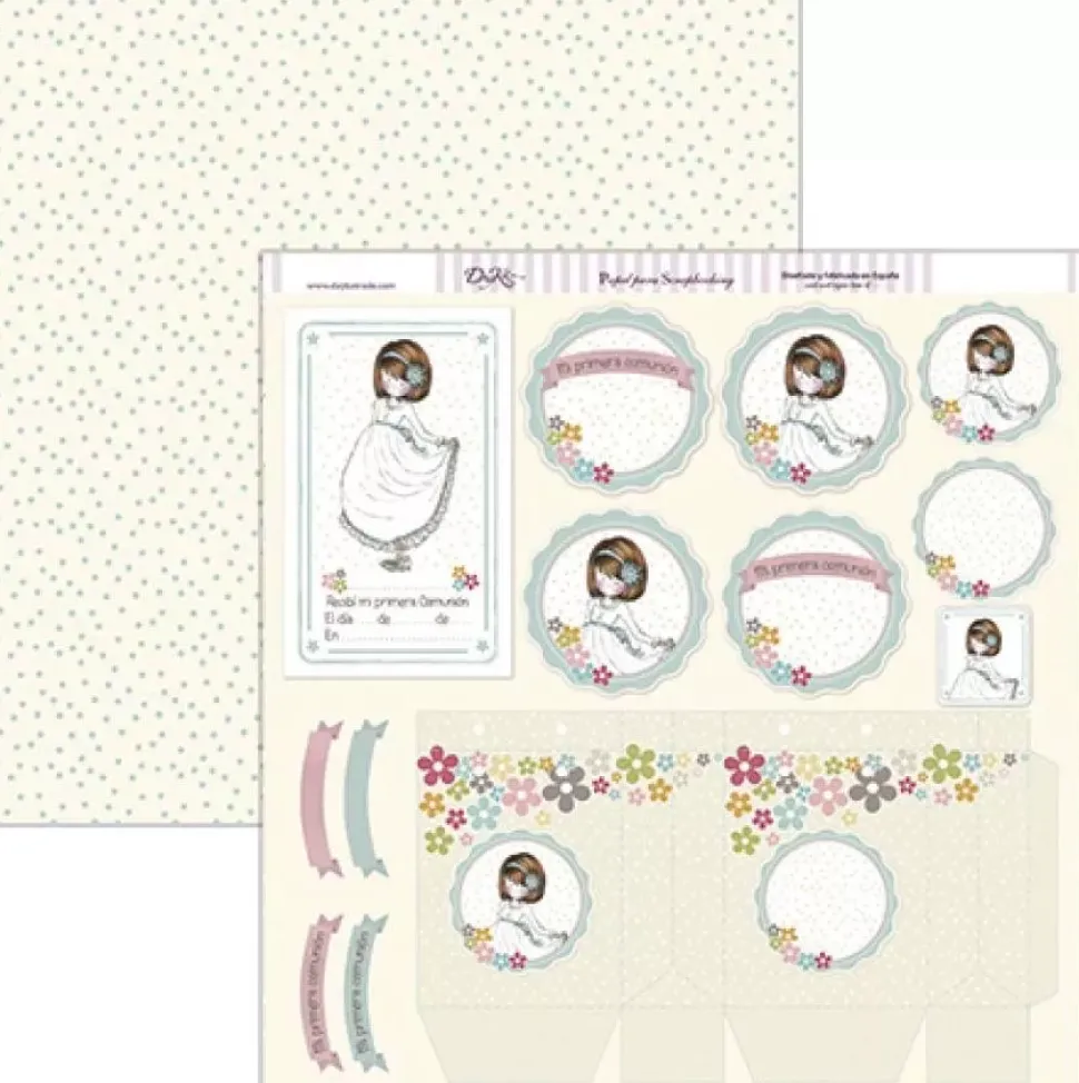 - – Papel estampado con galletas y etiqueta de niña de comunión y un recortable para hacer una bolsa. Por la cara posterior, lunares irregulares azules sobre fondo blanco roto.