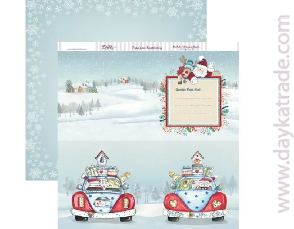 - – Papel estampado con la vista de un coche por delante y por detrás cargada de regalos con Santa como conductor, en la parte superior una etiqueta con la frase querido Papá Noel. Por la cara posterior, un marco de copos de nieve blancos sobre un fondo azul hielo.