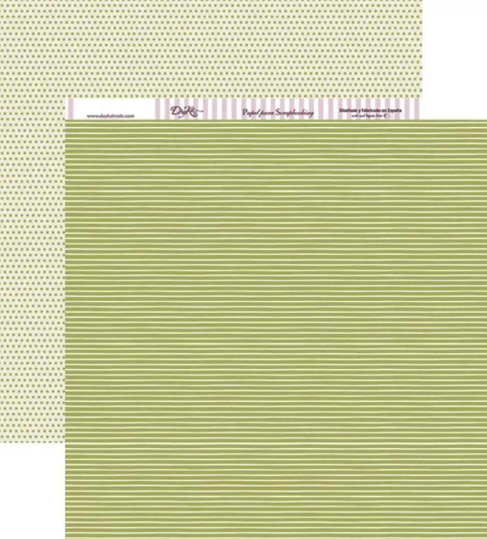 - – Papel estampado con lineas horizontales verdes y blancas. Por la cara posterior, lunares verdes pequeños sobre fondo blanco.