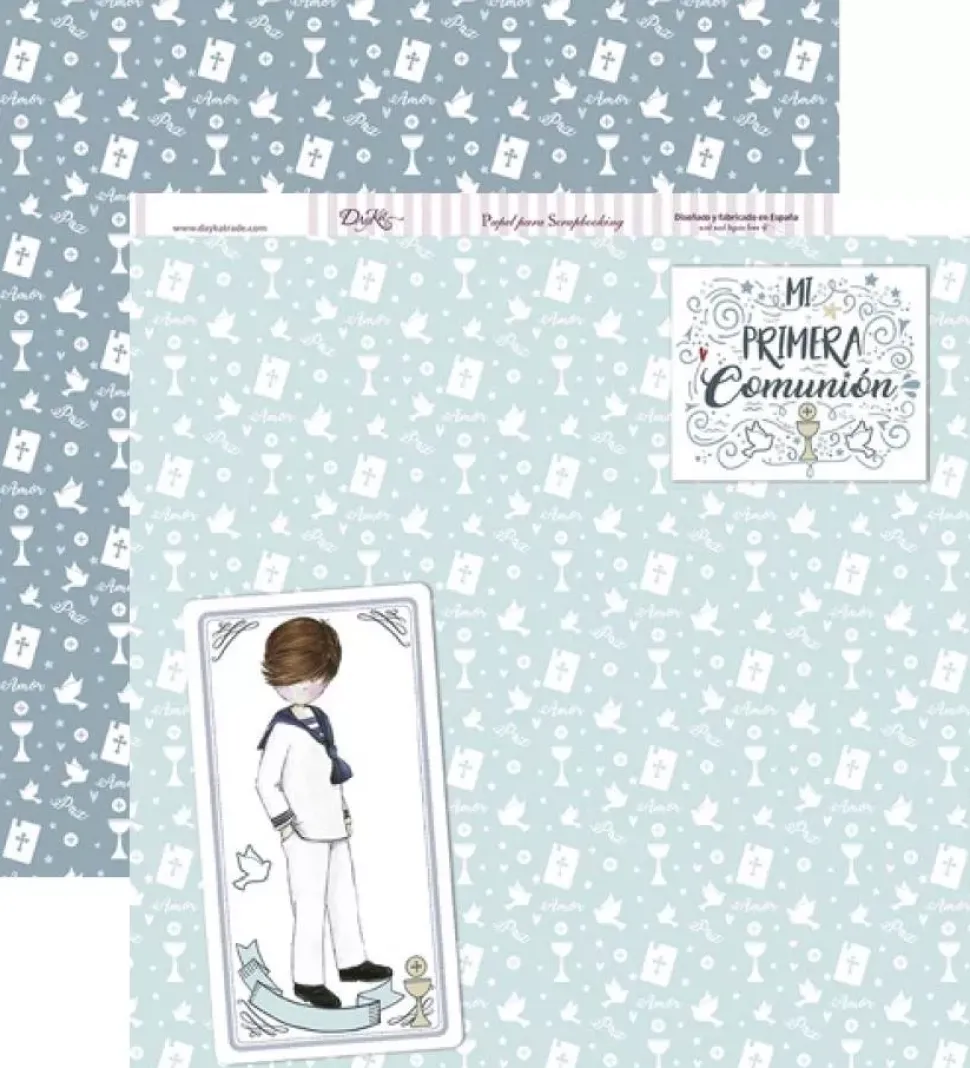 - – Papel estampado con una tarjeta de un niño de comunión vestido de marinero sobre fondo de palomas, cálices y biblias blancas y fondo azul claro Por la cara posterior, el mismo estampado de cálices, palomas y biblias blancas sobre azul más oscuro.