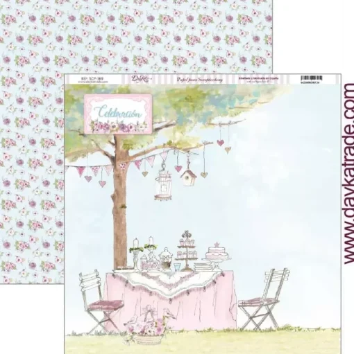 - – Papel estampado de una mesa llena de dulces y velas con dos sills bajo la sombra de un árbol con banderiens, corazones, casita de pájaros y jaula y un cartel que reza celebración. Por la cara posterior, repeticiones de pequeñas flores lilas, rosas y blancas sobre fondo blanco.