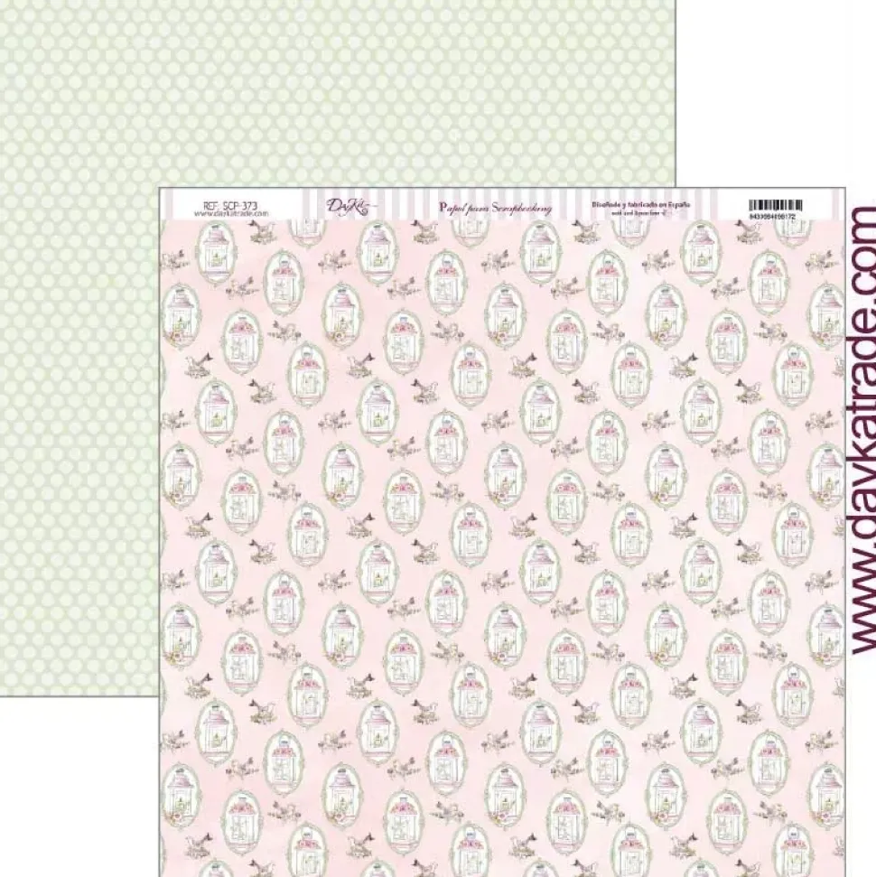 - – Papel estampado de pequeños candelabros decorados con flores inscritos en marcos ovalados que se combinana con pajaritos sobre fondo rosa de aguada. Por la cara posterior, lunares blanco roto sobre fondo verde.