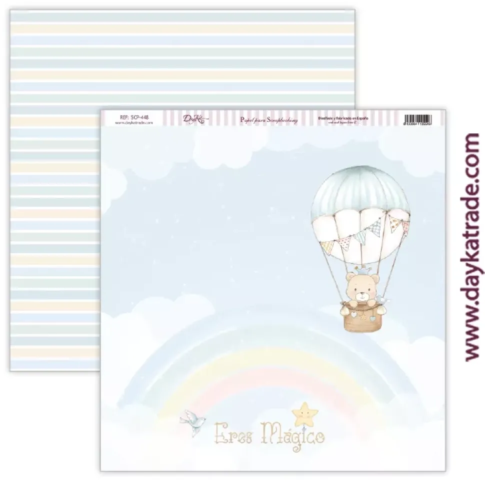 - – Papel estampado con ilustración de osito en globo aerostático sobre un fondo de arcoiris y nubes. Por la cara posterior encontramos un patrón de franjas de colores en colores pastel.