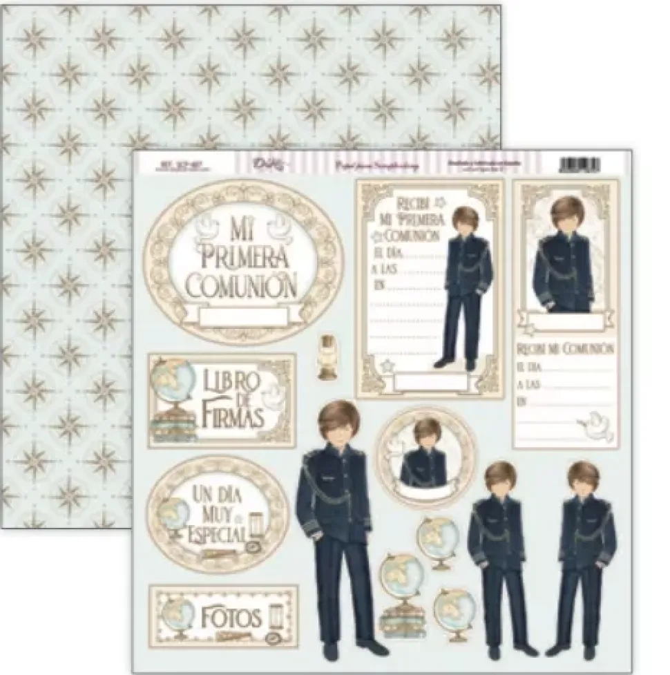 - – Papel estampado con tarjetas e ilustraciones de un niño vestido de comunión con traje tipo almirante. Por la cara posterior encontramos un patrón de estrellas con los puntos cardinales sobre un fondo azul claro.