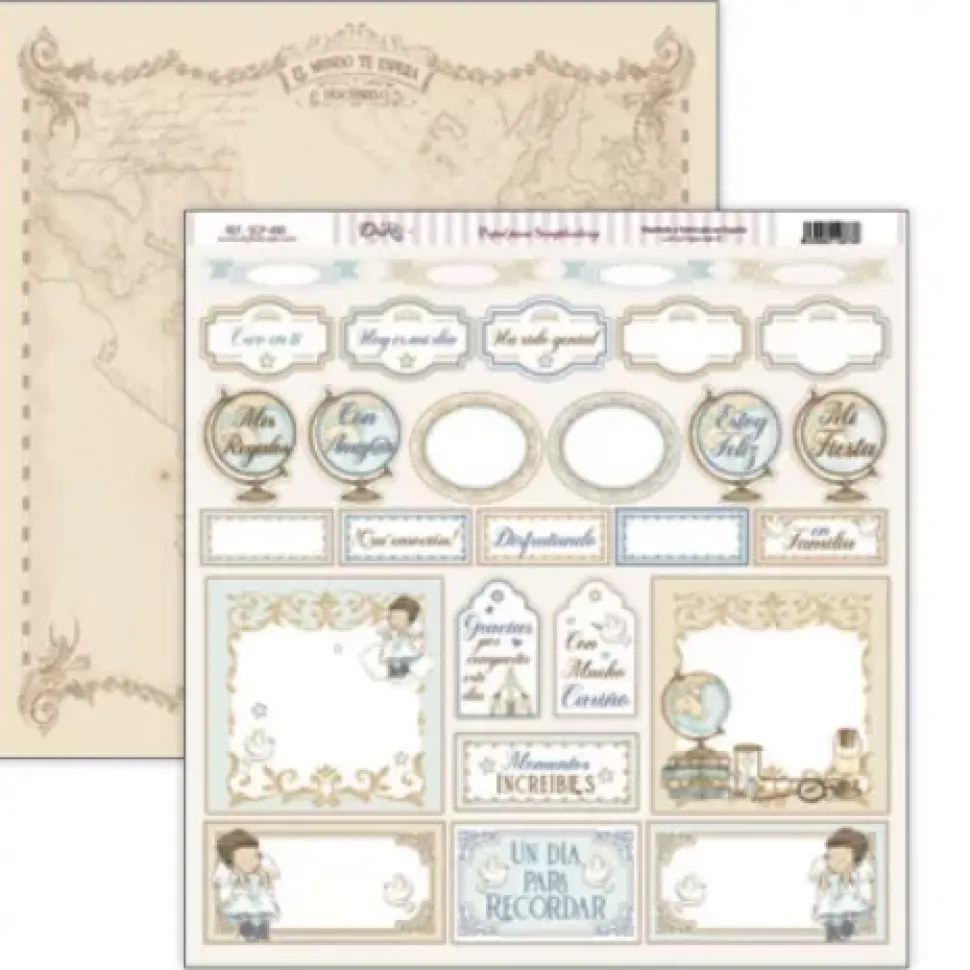 - – Papel estampado con tarjetas y etiquetas para recortar que incluyen los motivos de la colección. Por la cara posterior encontramos un estampado de mapa antiguo en tonos marrones.