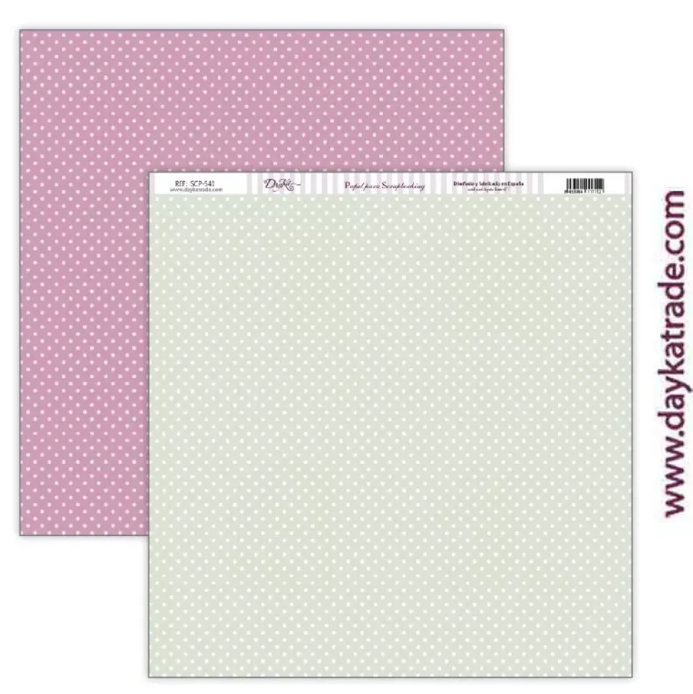- – Papel estampado con puntitos blancos sobre un fondo color mint. Por la cara posterior encontramos un estampado de puntitos blancos sobre un fondo rosa.