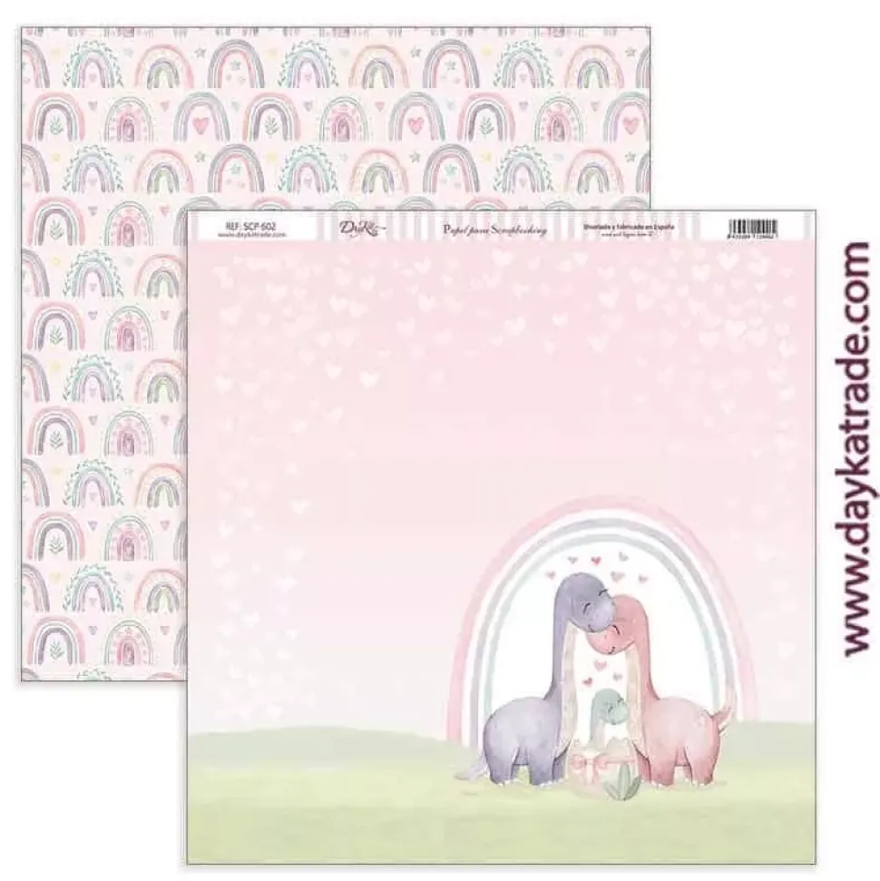 - Contiene la ilustración de 3 dinosaurios bajo un arcoíris y cielo rosa con muchos corazones por una cara. En el reverso del papel tiene un estampado de pequeños arcoíris en varios colores con fondo rosa.