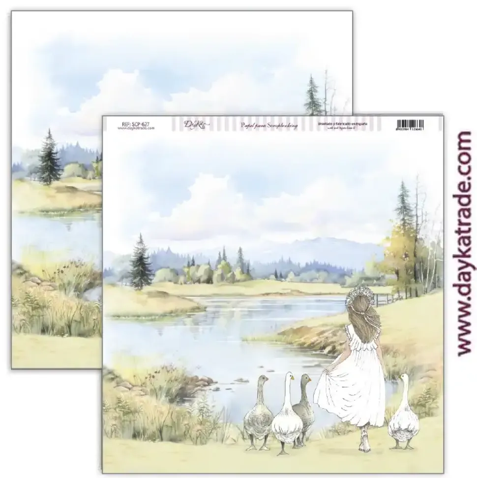 - Contiene ilustraciones de una niña vestida de comunión de espaldas frente al lago junto a ocas. El reverso está decorado con el mismo paisaje.