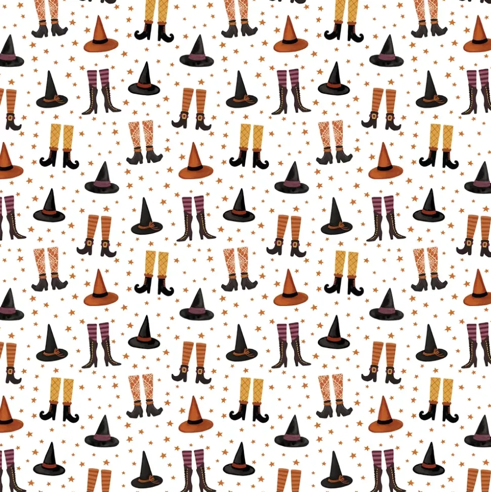 - Papel estampado con un patrón de zapatos y sombreros de bruja. La parte posterior del papel cuenta con un fondo naranja con pequeñas rayitas verticales en un tono más oscuro.