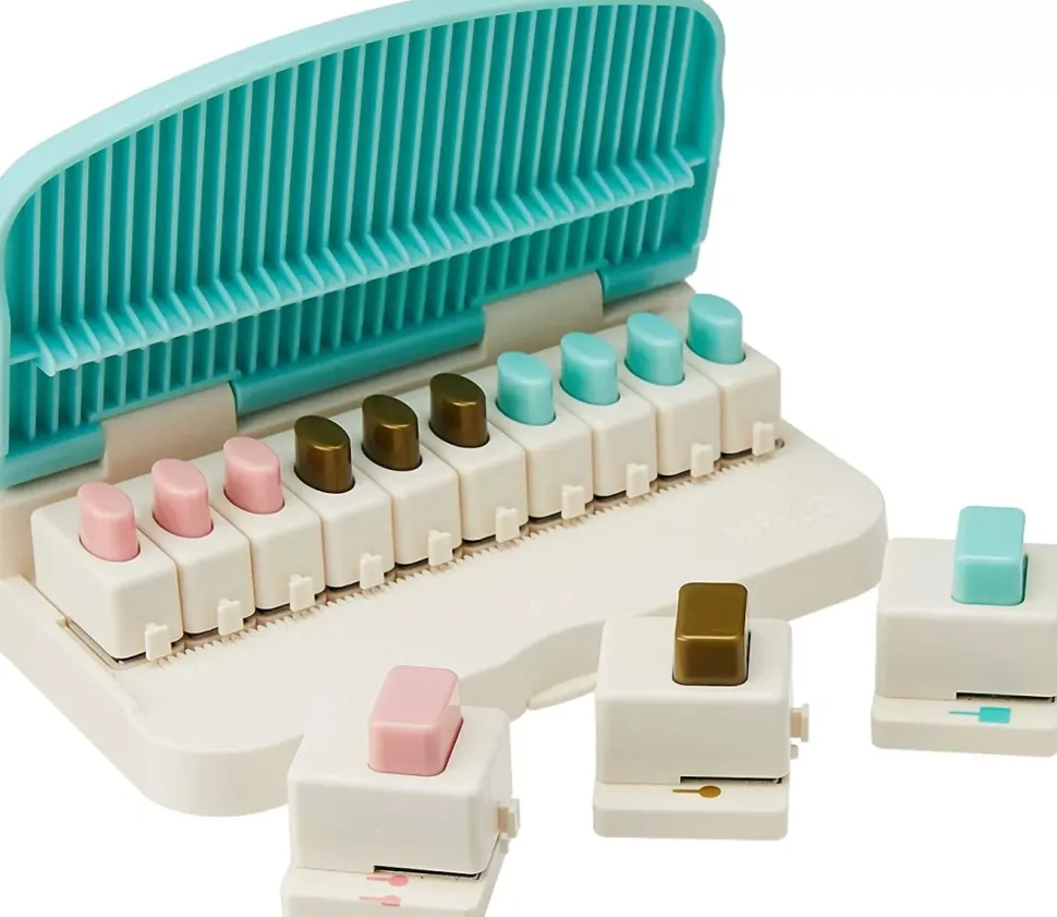 - Nuevos insertos perforación para espirales (botón rosa: orificio redondo pequeño; botón marrón orificio redondo grande, botón azul: cuadrado)