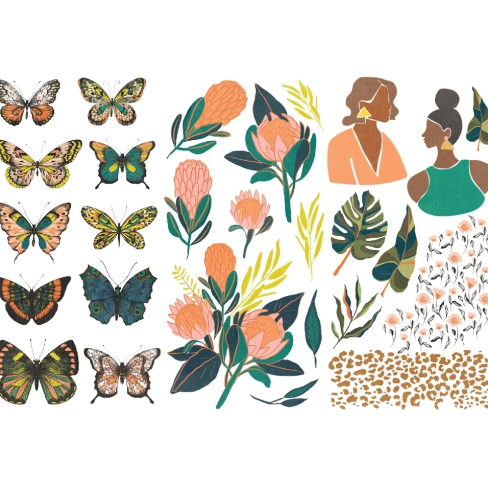 - Diseños de mariposas, motivos florales y perfiles de mujeres.