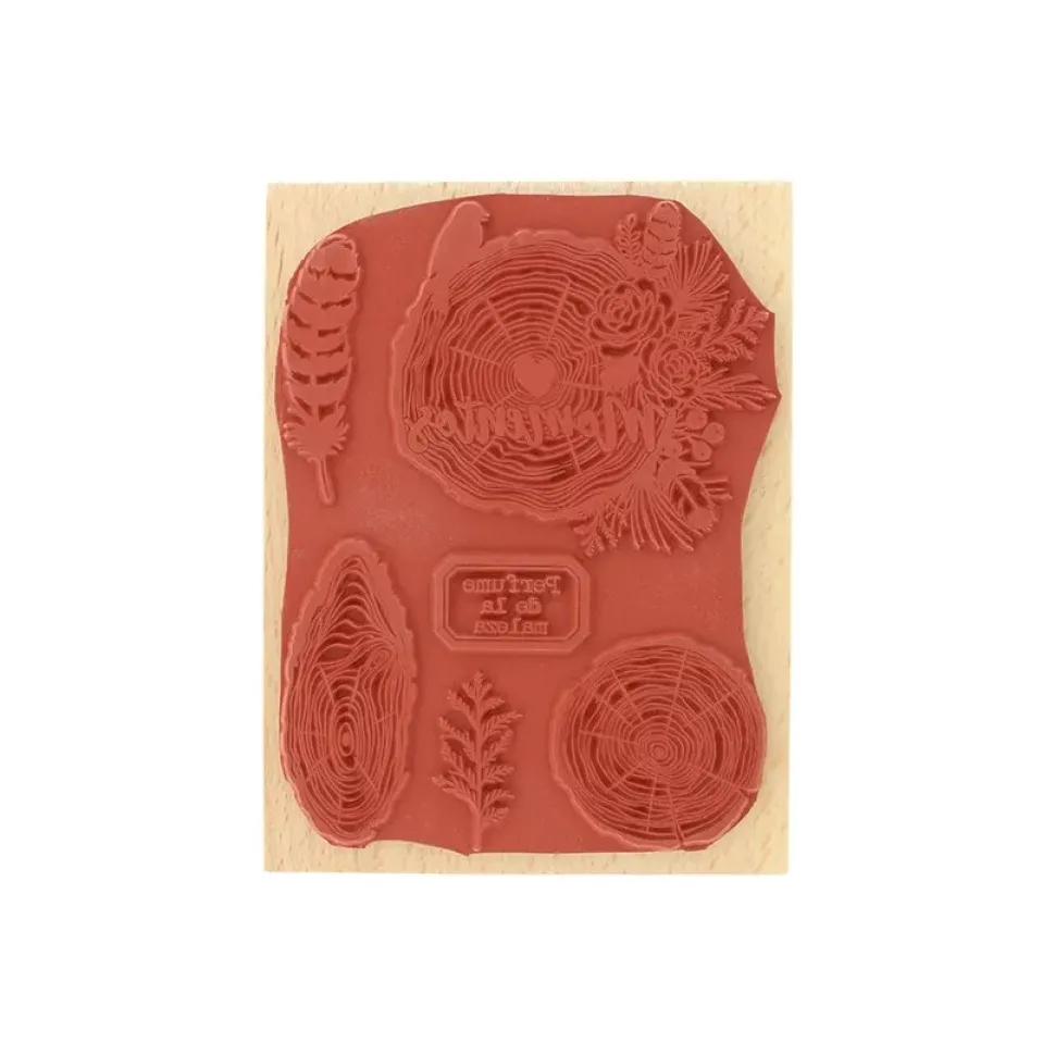 - Un sello con dtroncos, flores, pluma, rama y la etiqueta con la frase perfume de la naturaleza.