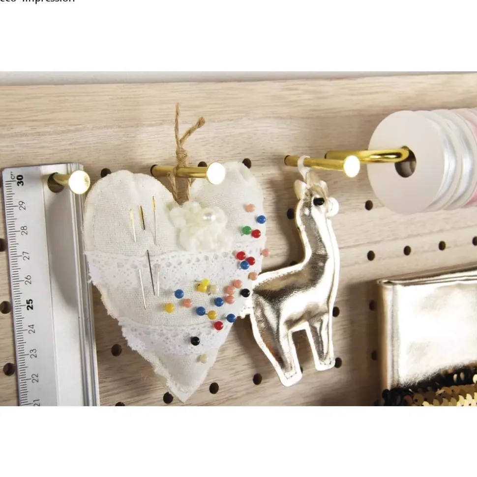 - Conjunto de cuatro ganchos dorados para colocar en tu Pegboard.