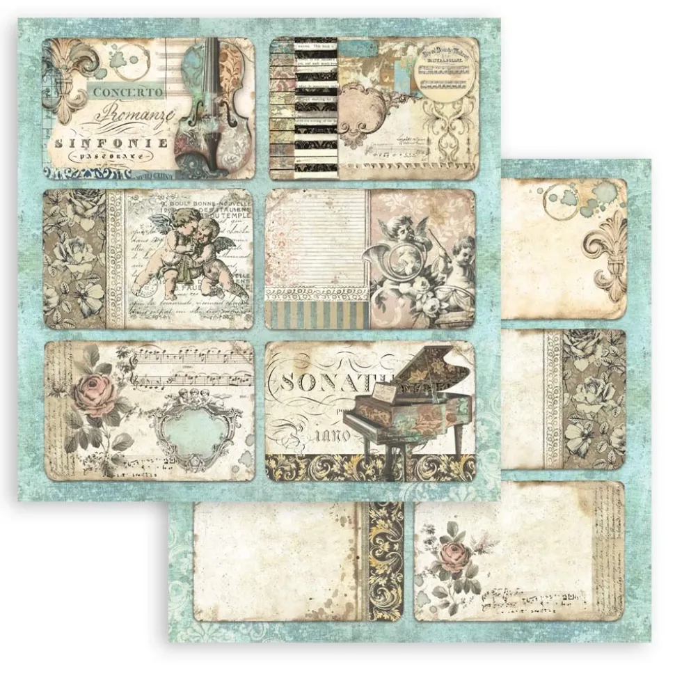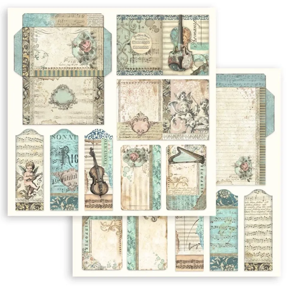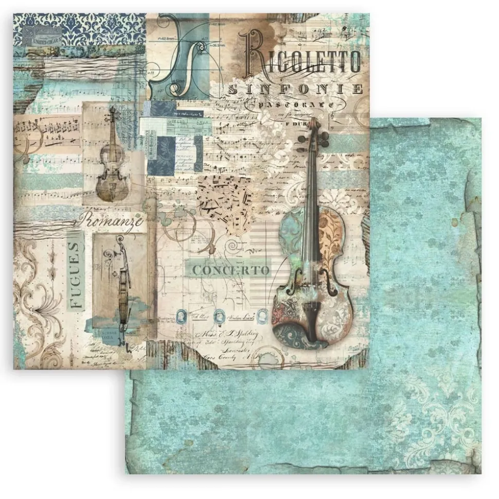 Music es la nueva colección de Stamperia. En ella los protagonistas son los instrumentos y las partituras, con ilustraciones de estilo vintage que combinan turquesas y marrones. La armonía de la colección inspira a la creatividad con intrincados detalles y hermosos complementos, para crear proyectos únicos y atemporales. Descubre sus papeles y disfruta con todos sus complementos, como die-cuts, stencils, sellos y mucho más. ¡Descubre ya Music!