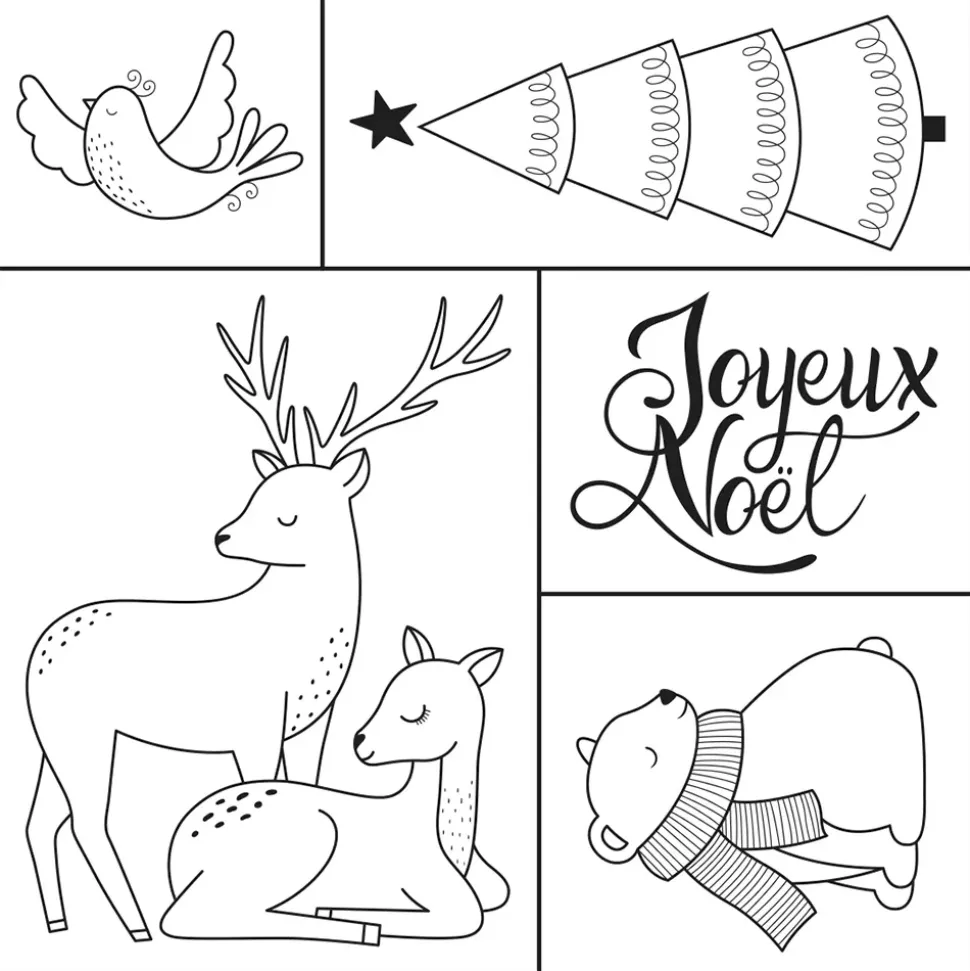 - Caja con 5 sellos de madera con diseños de árbol de navidad, ciervo, oso polar, paloma y joyeux noel.