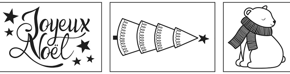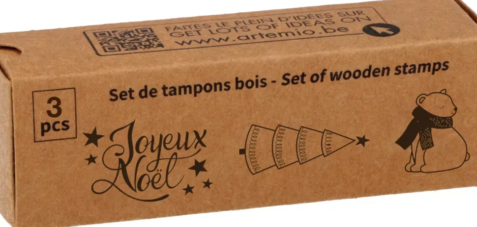 - Caja con 3 sellos de madera redondos con diseños de un abeto, un osito, un sentimiento en francés.
