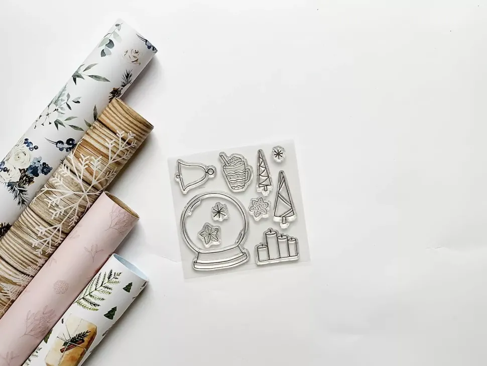 - Set de sellos acrílicos con diseños como copos de nieve, abetos, una taza de chocolate, etc.