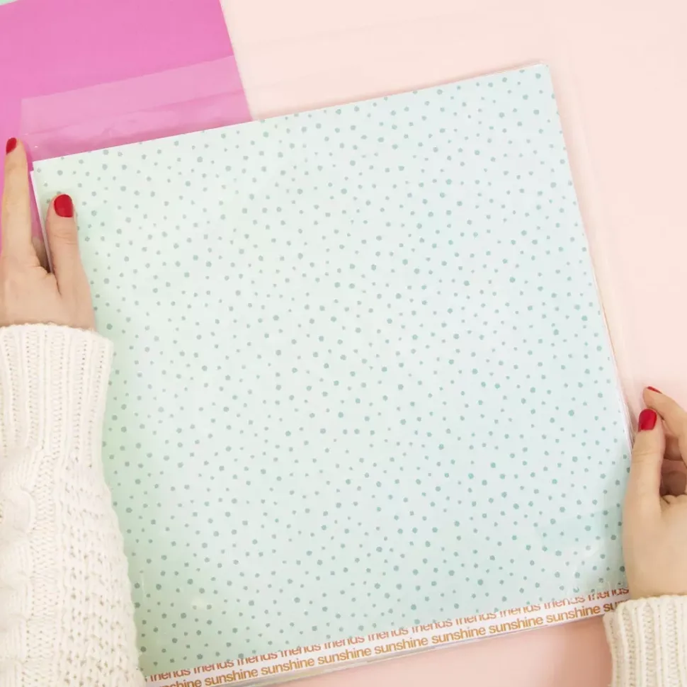 - Sobres transparentes para guardar papeles de 30,5 x 30,5 cm (12″x12).