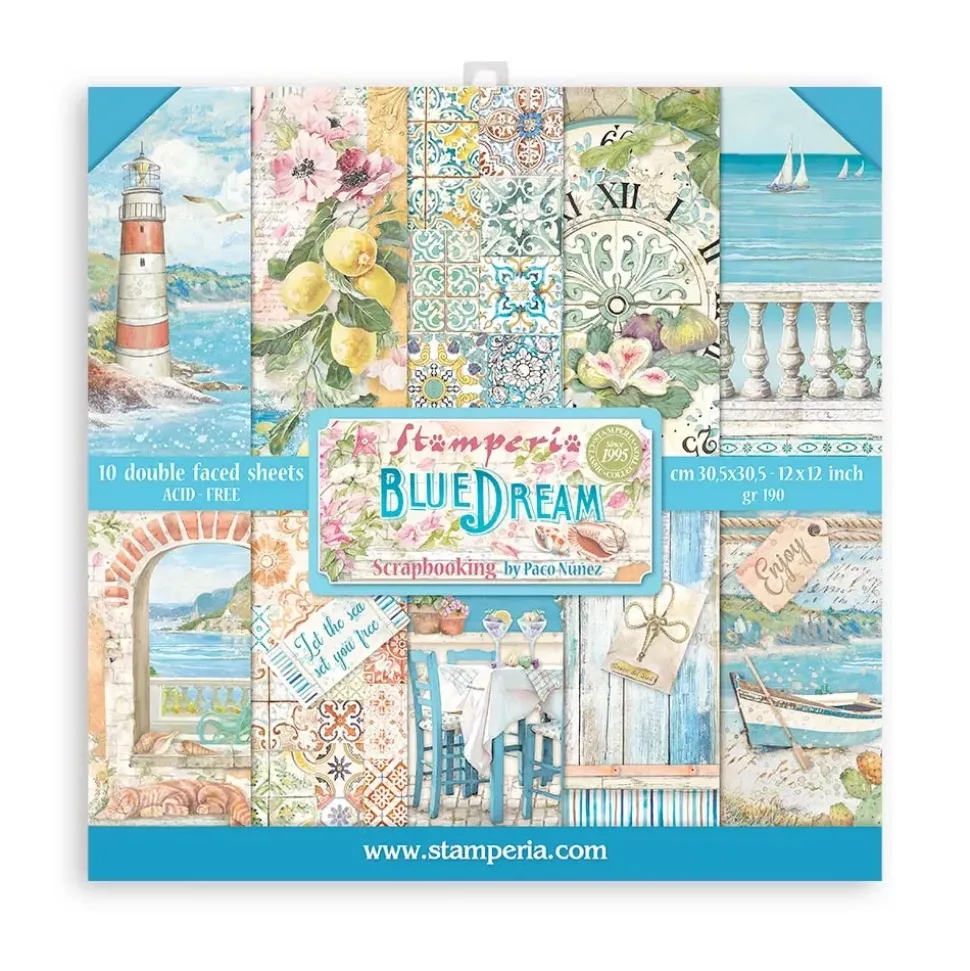 Os presentamos Blue Dream, la primera colección de Paco Núñez para Stamperia. Esta colección te transportará a orillas del mar Mediterráneo, con sus preciosas ilustraciones de playas, barcas en la arena, balcones con vistas repletos de flores… Viendo sus papeles casi podrás sentir la calidez del verano junto al mar. Con Blue Dream podrás crear increíbles proyectos al más puro estilo mediterráneo, a los que no les faltará ningún detalle gracias a todos sus complementos como sellos, stencils, die-cuts o texturas. ¡No la dejes escapar!