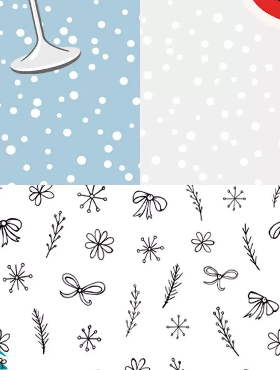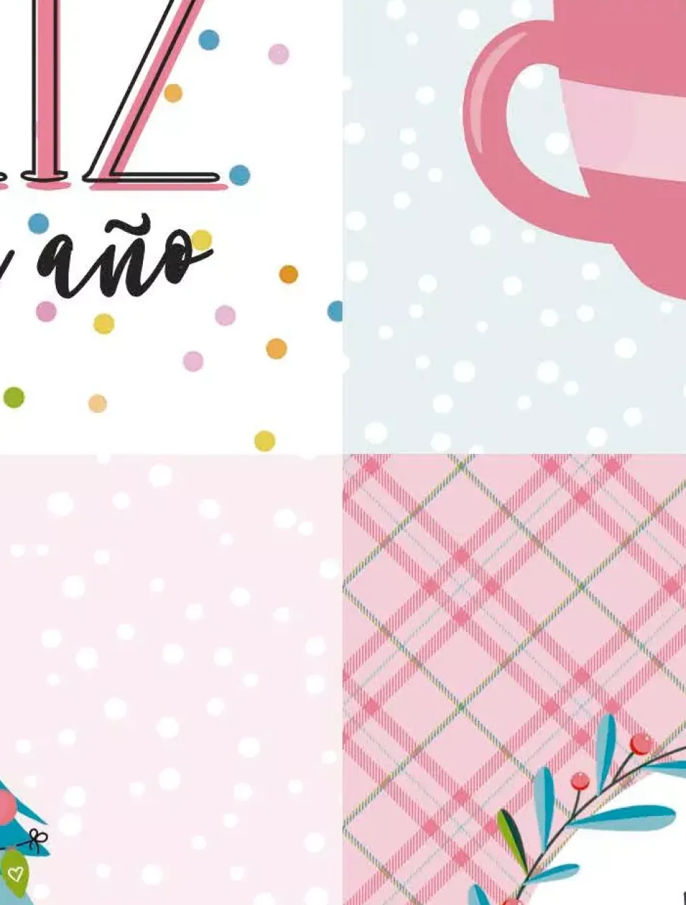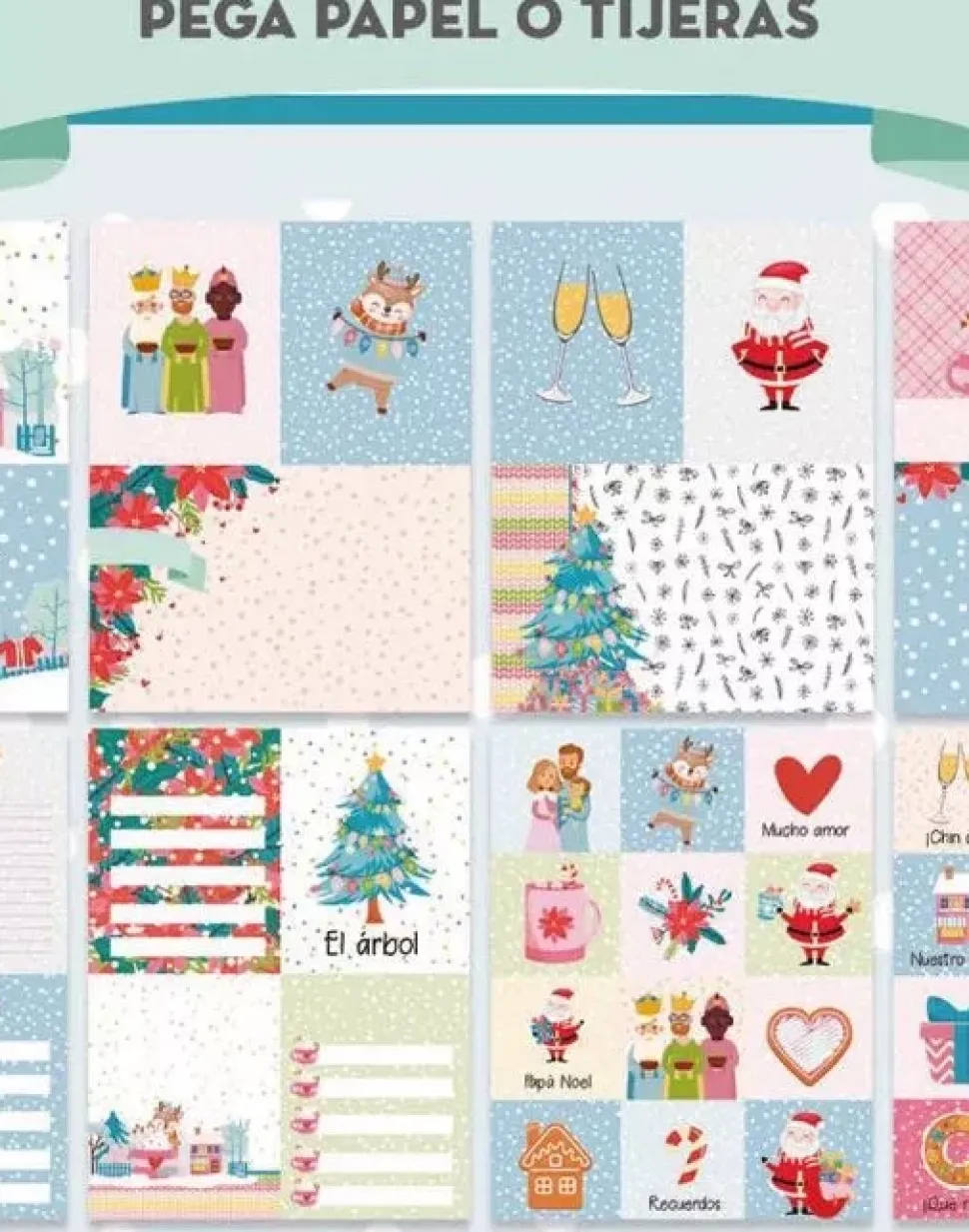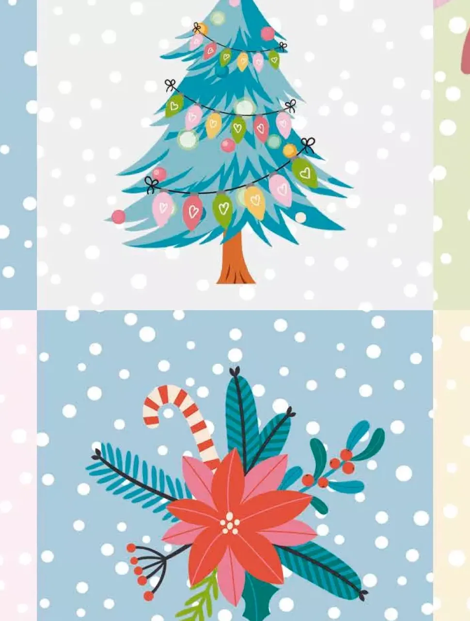 - Contiene ilustraciones de navidad con árboles, dulces, regalos y patrones geométricos.